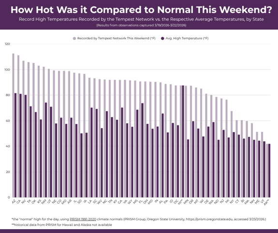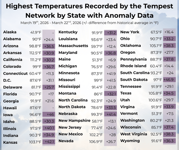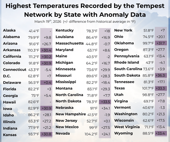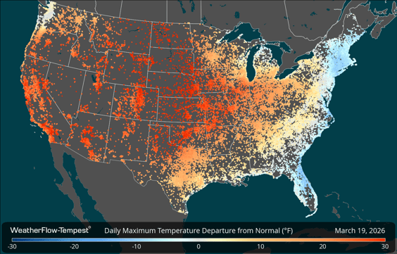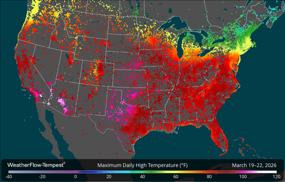 (Tables may need to be scrolled to view full data on mobile devices) March 19th, 2026 kicked off a widespread heat event that developed across most of the United States, bringing temperatures well above seasonal norms and, in some cases, into record-breaking territory. By the weekend, the pattern had intensified - pushing anomalies to extremes rarely seen this early in the year - before another passing system brought a sharp return to more seasonal cooler conditions. Let's take a closer look at how the event unfolded, using observations from the Tempest Network to highlight both the scale and intensity of the heat.